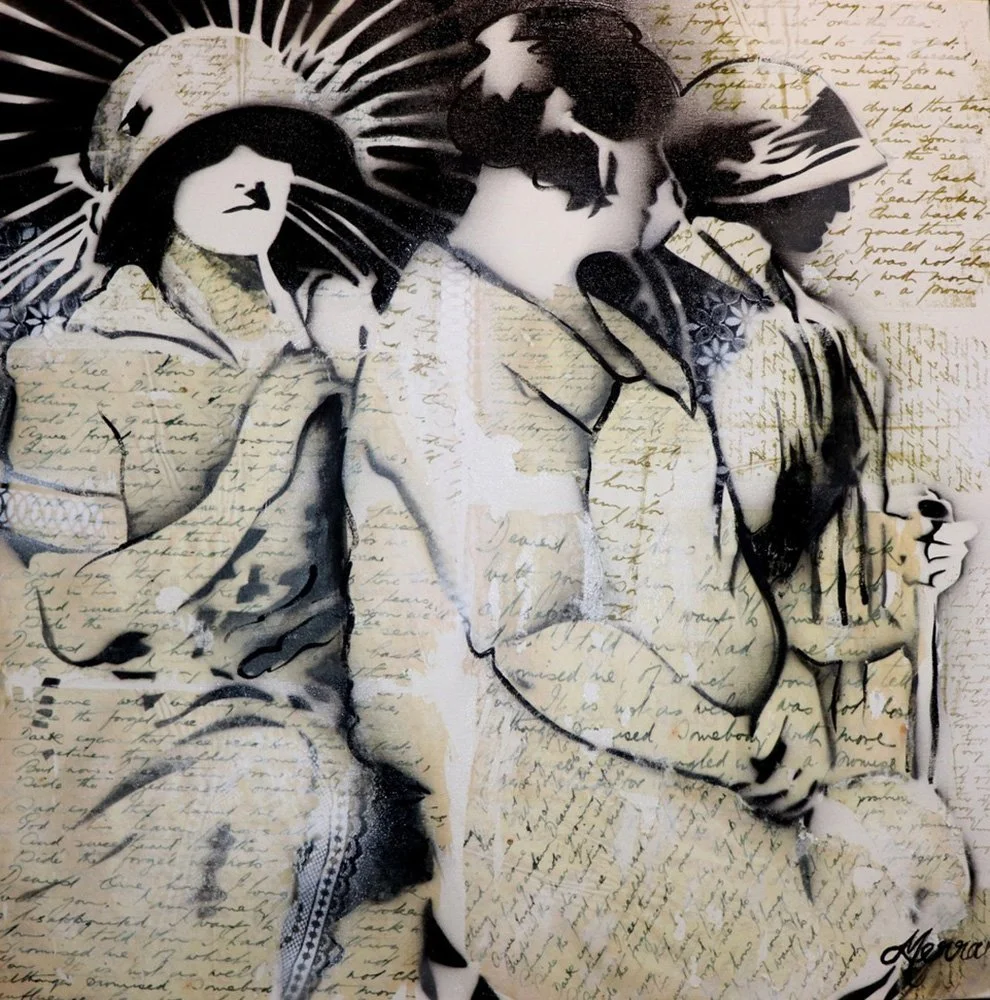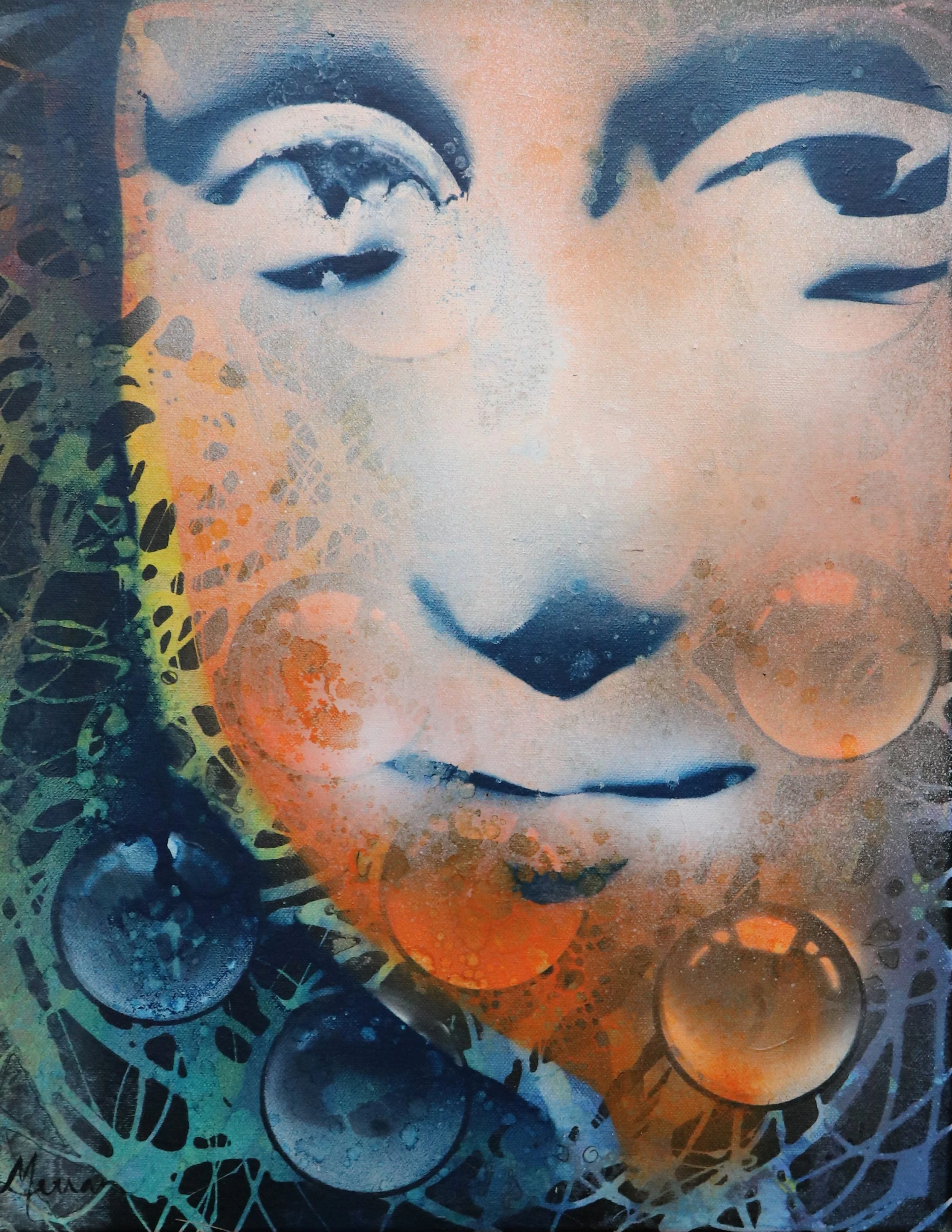 Aerosol paintings are created on canvas or wooden supports. After many, many hours of cutting a stencil, there is that anxious and long anticipated moment after the spray when you pull back the mask and reveal your work.